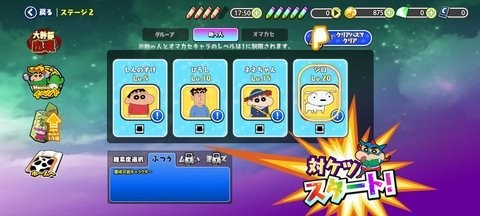 2、选择不同的角色,如蜡笔小新、妹妹小桂子、宠物小白等,拥有不同的技能和属性;