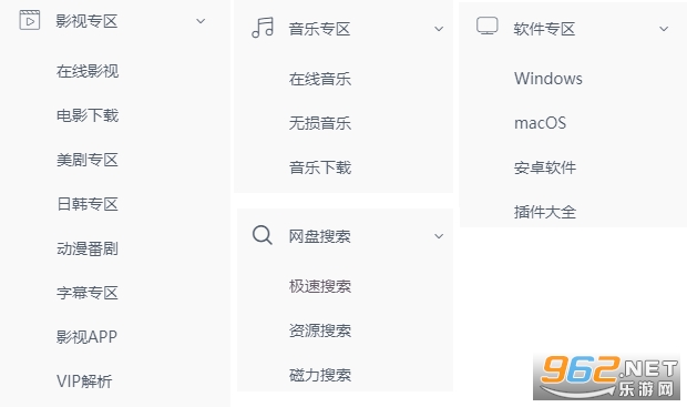 所以娱乐部分分为四个小部分:影视专区、音乐专区、软件专区、网盘搜索。