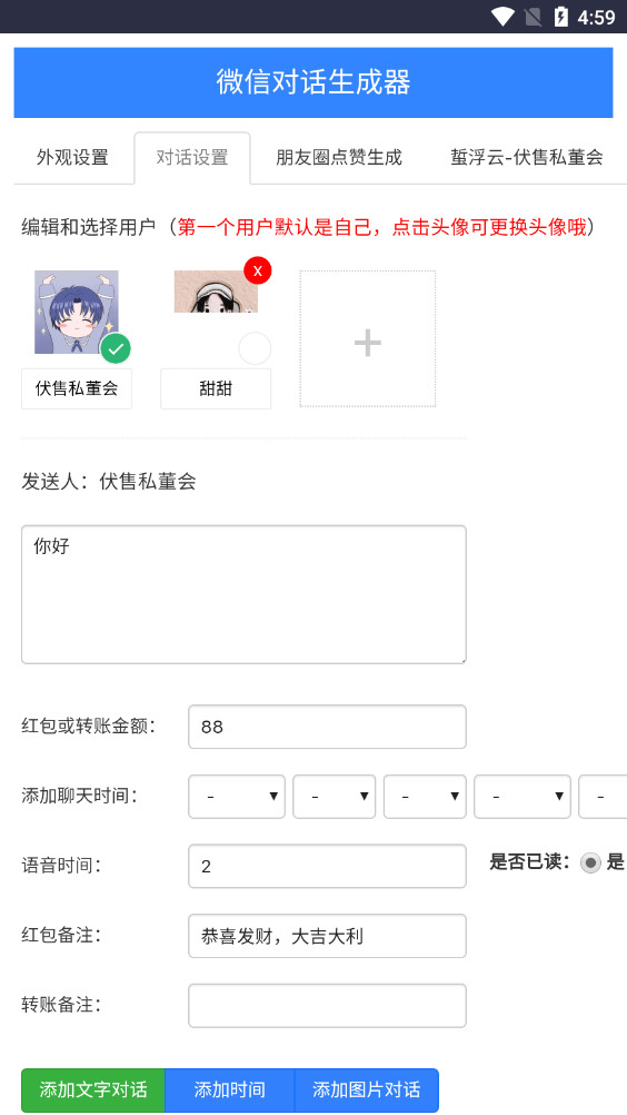 微信聊天模拟器免费版模拟微信聊天的工具,可以添加不同用户角色进行对话,微信聊天模拟器单机支持发送文字、语音、图片、红包、转账等。可以将聊天记录一键生成为图片、长截图、动态图片和视频。