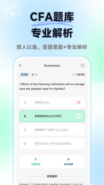 安卓揽星CFA是一款专为准备特许金融分析师(CFA)考试设计的应用程序。它集成了丰富的题库资源,包括章节练习、模拟测试以及历年真题,并覆盖所有重要的知识点。揽星CFA不仅提供个性化的学习路径规划,还具备动态评估反馈机制,确保学习者能够高效备考,轻松应对考试挑战。
