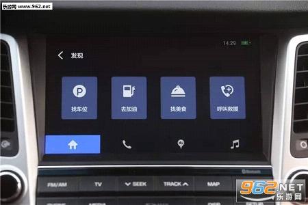 总结起来有四个主要功能,呼叫救援、打电话、用导航和放音乐。呼叫救援功能在发现图标中,打开发现,里面还有找车位、去加油、找美食三个选项。其实这三项和地图中的附近搜索栏里的选项有重叠,其实就是把最常用的这三项优先级提升到快捷操作。