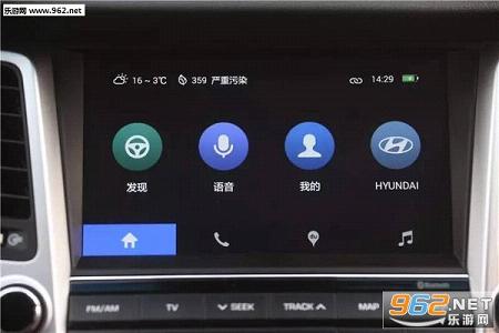 连接成功后在车机菜单中就出现了百度CarLife图标,点击进去就开始进入应用。主界面比较简洁,上排是天气、空气质量、时间和电量的显示信息,中间是发现、语音、我的、和HYUNDAI四个图标,下排是主页、电话、地图和音乐四个菜单。这是把车主们常用到的功能搬了过来,你要还想发个微博、聊个微信或者看个新闻,在行车中操作太危险,所以百度CarLife的功能设置还是比较科学的。