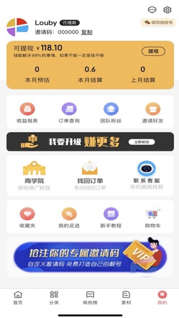 购买成功5分钟之内返现金余额立刻展现在七品街个人帐户中。