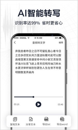 3.拥有高清录音功能,您可以将好的声音和好的想法瞬间记录下来,并将其变成美丽的文字分享给您的朋友。