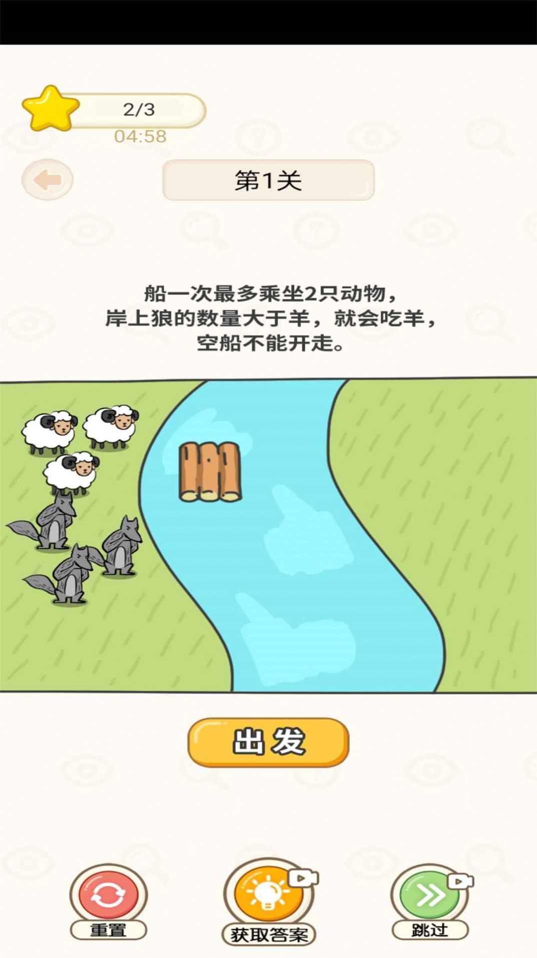 安卓《奋斗吧小羊》游戏中拥有非常多可爱的益智类问题,玩家需要用不同的方式将小羊运送到河的对岸,并且不让狼伤害羊,因此就非常考验玩家的思维能力了,游戏中拥有非常多不同关卡,