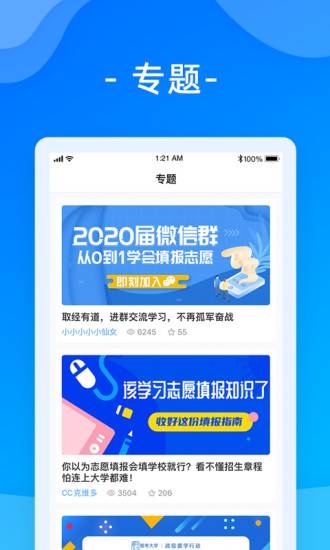 报考大学app是一款高考生必备的志愿填报工具,帮助所有家长和考生合理高效进行志愿填报,报考大学app在最短的时间内不浪费每一分,让用户得到最佳的填报效果。志愿填写是一件人生中一个非常重要的选择,那么这样的大选择一定是要三思而后行。报考大学app是你填报志愿的优秀军事,凭借出色的大数据分析能力为你智能匹配合适的大学,所有相关信息全部为你一网打尽,只需一个软件,就可以熟知所有的事项,为你的报考提供便利。报考大学app从大学专业选择着手,为你精确计算所选择大学的录取概率,还有专家1对1的分析指导,任何疑问都帮你轻松解答。模拟填报志愿,正式填报不再迷茫。报考大学app与时俱进的高考志愿相关话题互动等你来参与,快来下载试试吧。