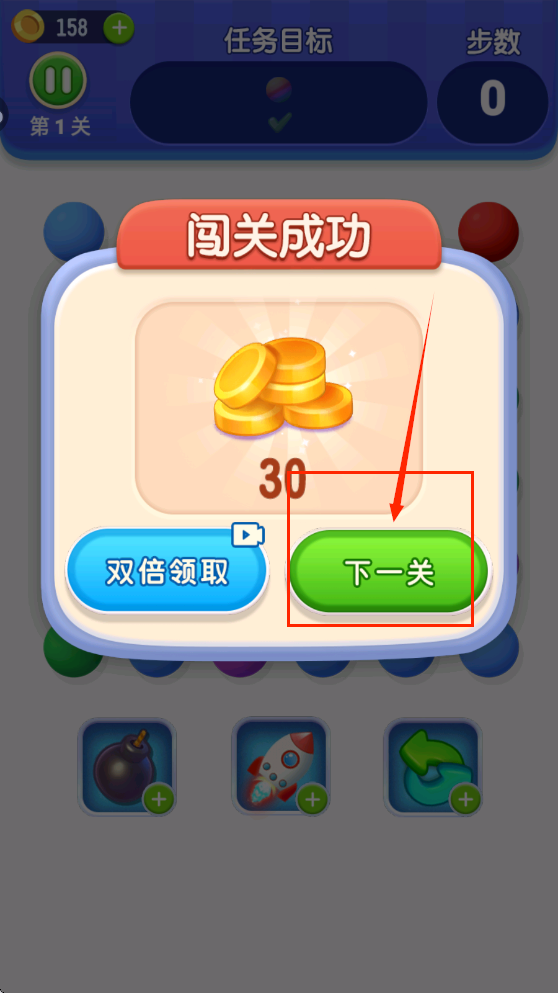 1、基础消除操作:滑动连接相同颜色球球,点击使用道具。