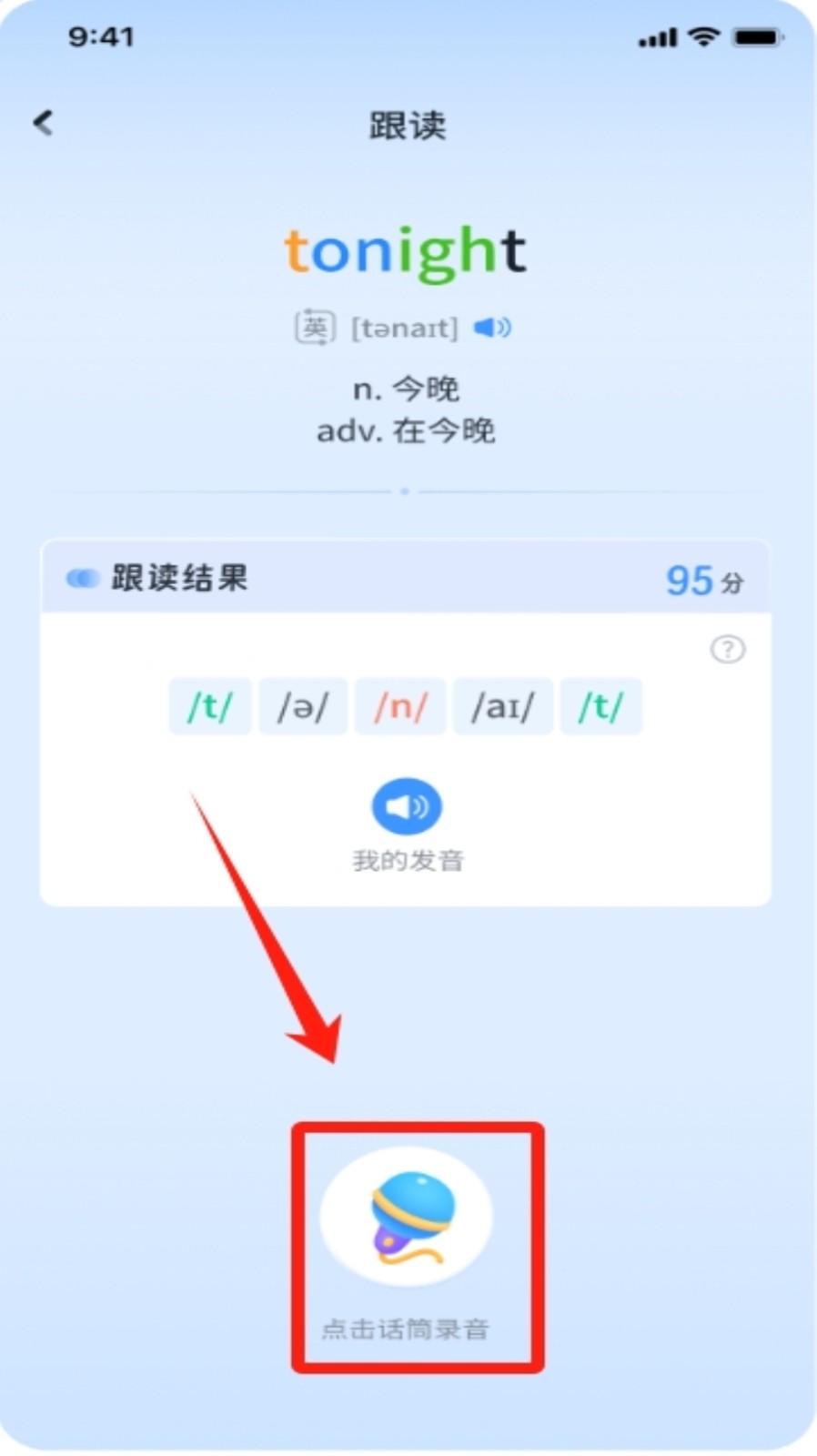 4、进行单词跟读练习, 在“跟读”页面点击录音按钮开始跟读提高发音准确性。