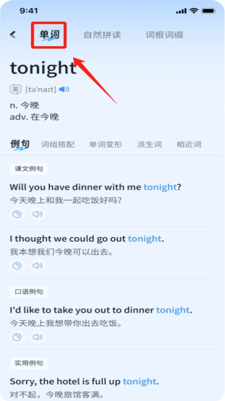 2、查看单词详情并学习例句,在应用中点击“单词”选项学习。
