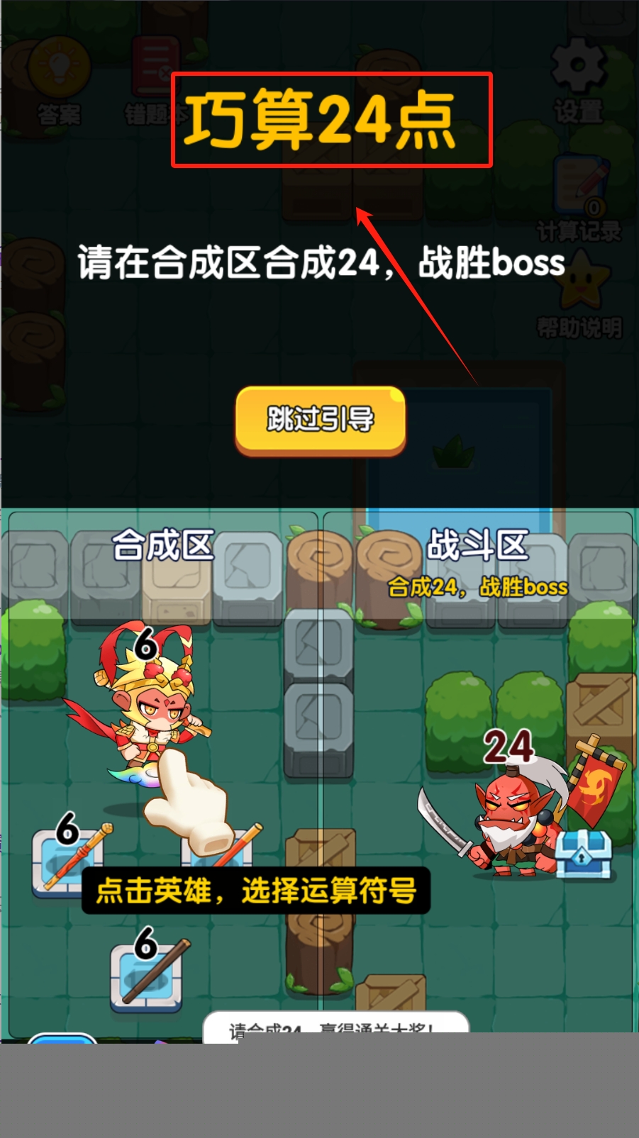 2、点击“巧算24”进入游戏,通过合成数字达到24,战胜boss。