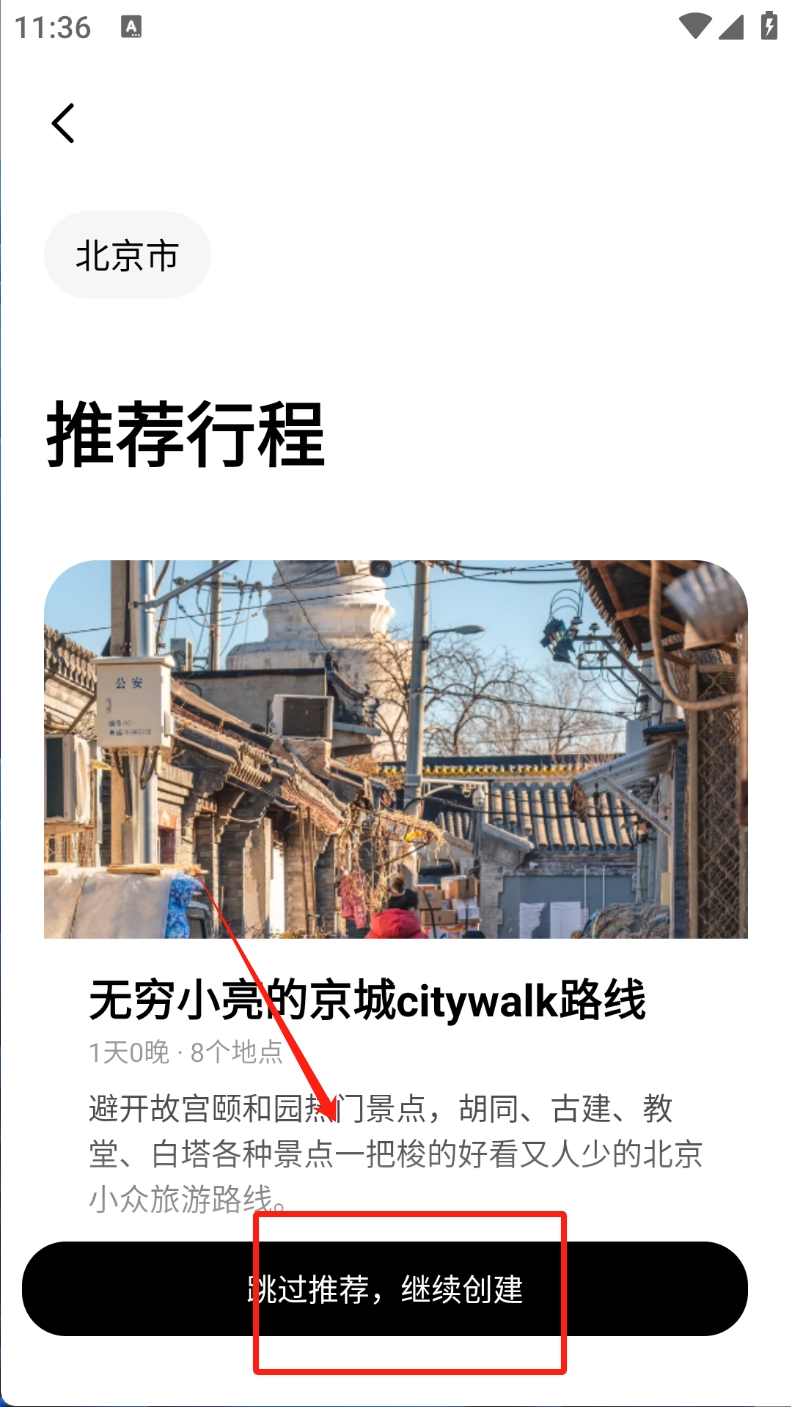 2、跳过推荐:在推荐行程页面,点击“跳过推荐,继续创建”按钮,开始自定义行程。
