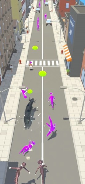 2、控制牛在街上横冲直撞,避开街上的行人,在公牛运行模拟器关卡中收集金币;