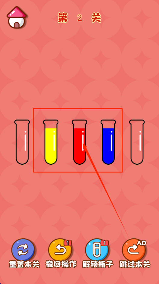 3、多功能操作辅助:重置撤回解锁新试管跳过等操作元素齐全,合理运用可化解僵局,降低闯关难度。