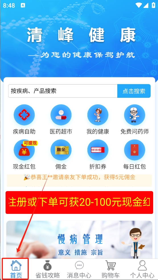 1、点击首页,进入应用主界面,开始探索健康服务功能。