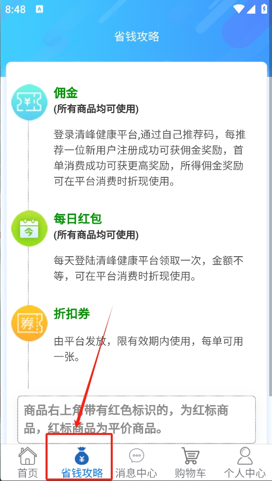 2、访问省钱攻略页面,了解如何通过应用节省医疗费用。