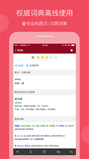 1、软件提供多种翻译,西汉-汉西词典、西语近义词词典、西西词典、西英词典。