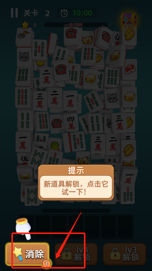 2、移动麻将实现三消:通过移动麻将,将相同图案的麻将组合在一起,实现三消,获得分数。