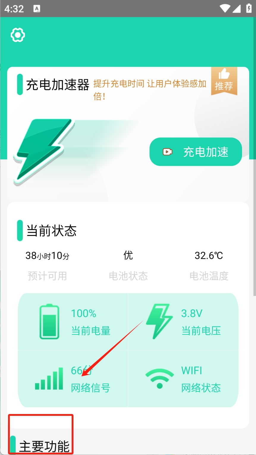 1、点击“主要功能”查看电池状态和网络信号。