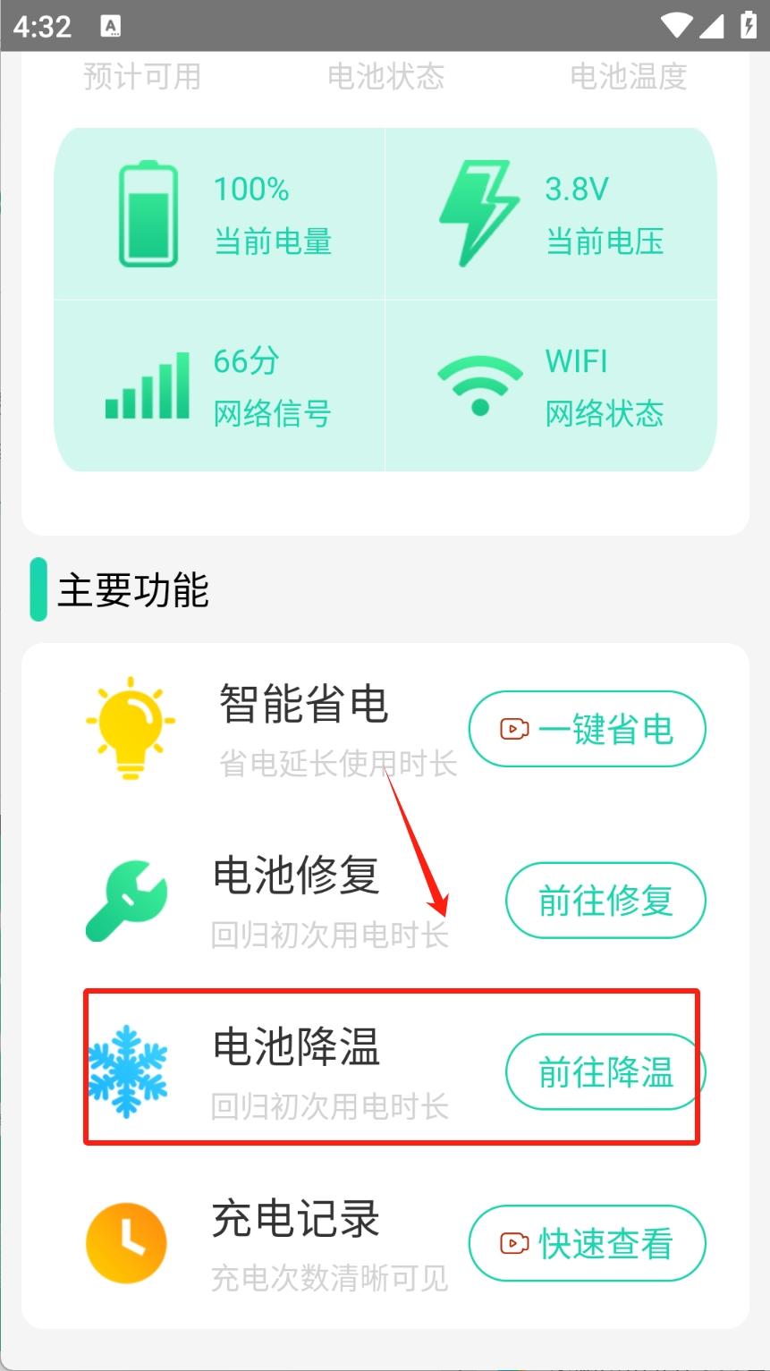 3、点击“一键降温”按钮,降低电池温度。