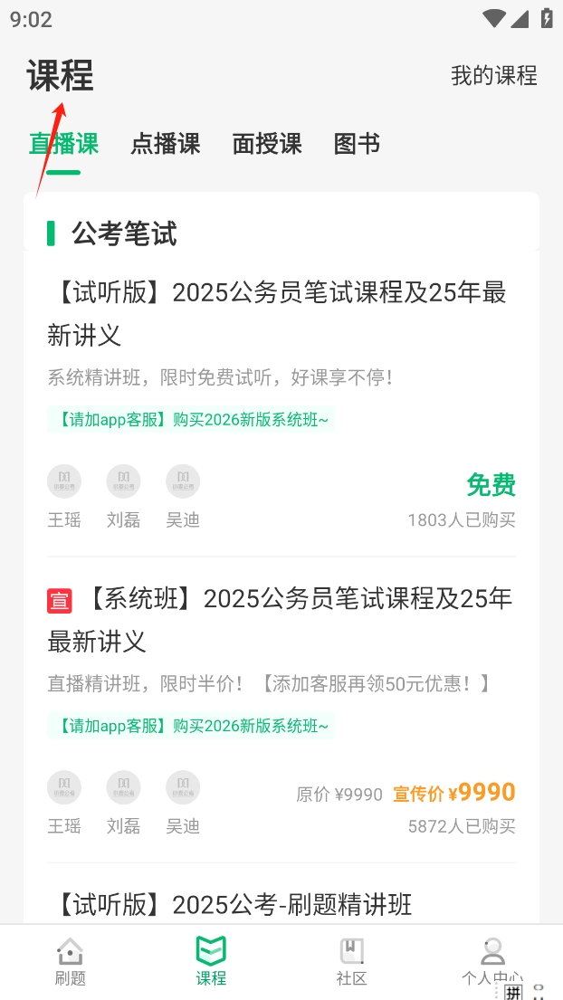 2、选择“直播课”查看课程列表。