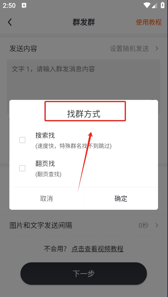 1、点击首页中的“群发群”选项,进入群发设置页面。