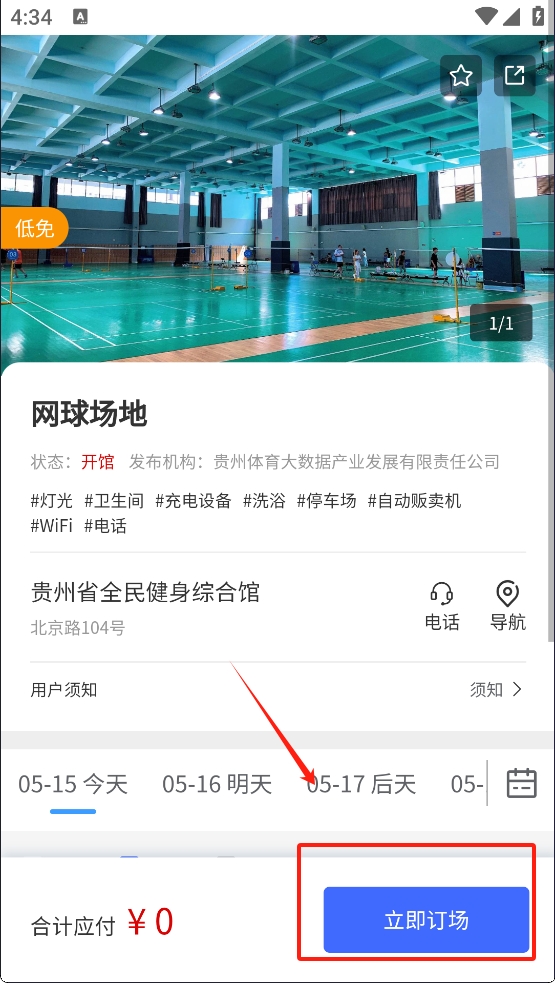 4、在预订页面,确认选择的场地和时间后,点击“立即订场”按钮完成预订。