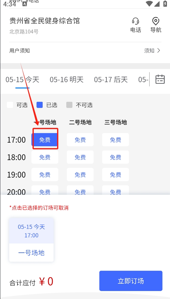 3、在场地列表中,选择您希望预订的场地和时间段,点击“免费”进行预订。