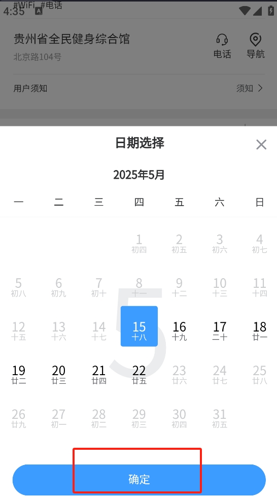 2、点击日期选择器,选择您希望预订的日期,然后点击“确定”完成选择。