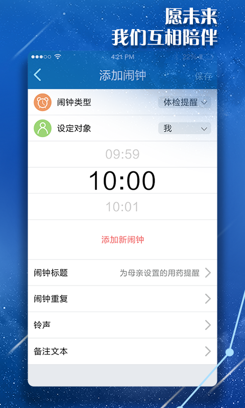 1、用户可以通过添加闹钟来提醒所有家庭成员,类型和标题可以自由设置。
