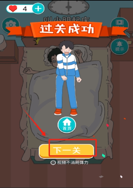 3、完成起床任务后,点击“下一关”按钮,继续小明的校园生活流程。