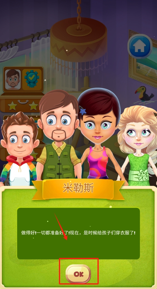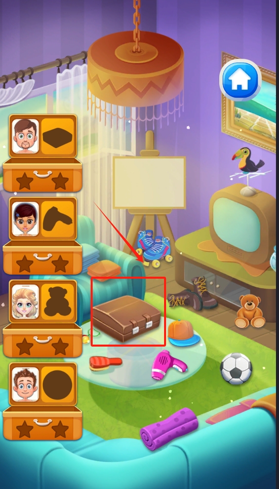 1、观察游戏界面,找到并点击茶几上的棕色行李箱,获取角色换装所需的衣物。