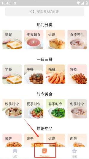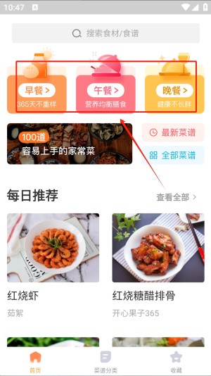 3 、在菜谱分类页面,您可以通过点击不同的分类标签,如“热门分类”、“一日三餐”等。