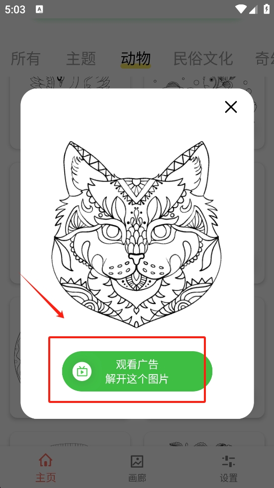 3、如果图案被锁定,点击“观看广告解开这个图片”按钮,通过观看广告来解锁。