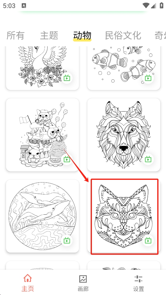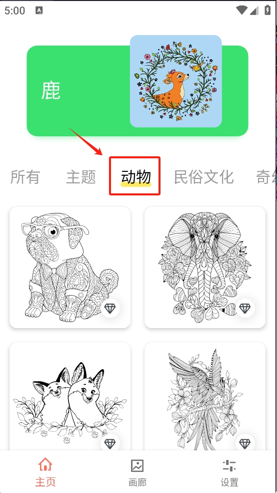 1、在应用中点击“动物”标签,浏览并选择您想要涂色的动物图案。