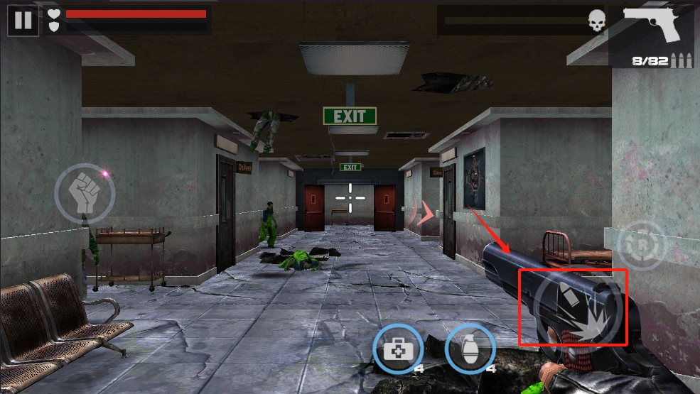 2、通过左下角摇杆控制角色移动,点击右侧射击按钮,击败僵尸完成任务。