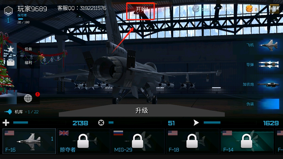 1、点击 “开始” 按钮,进入战斗机驾驶舱,准备起飞。