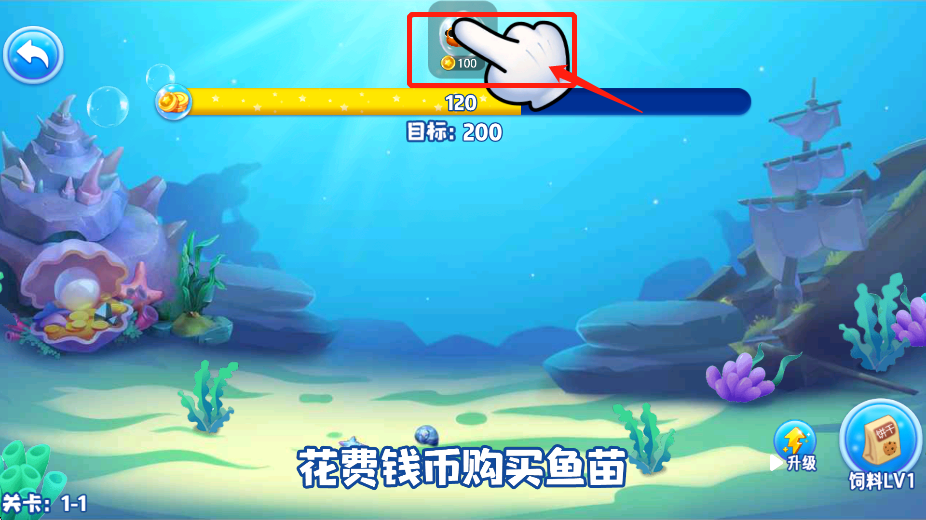 3、鱼饿了点击按钮投喂饲料,并收集金币。