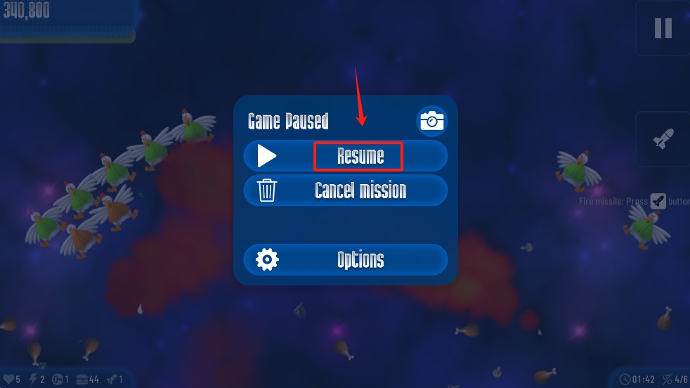3、游戏中途暂停后,弹出提示框,点击“继续”按钮,可以快速恢复游戏进程。