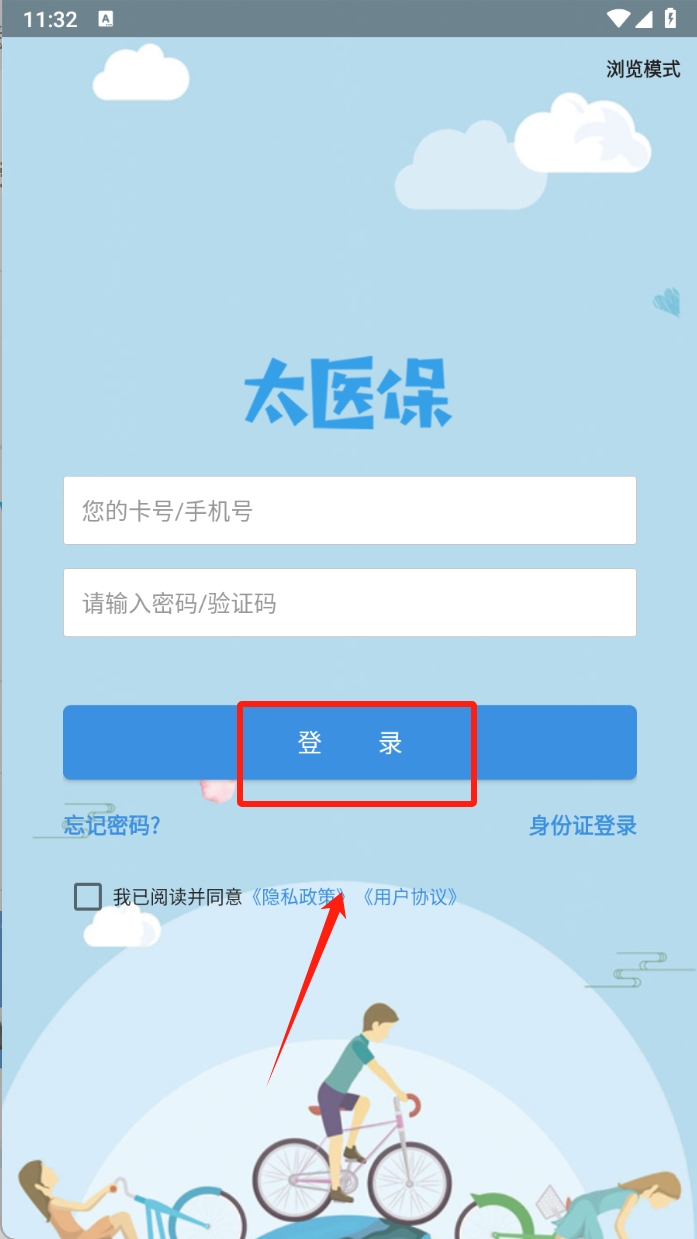 1、第一步:在登录页面,输入您的卡号/手机号和密码/验证码,勾选同意协议后点击“登录”按钮。这样可以进入太医保软件的主界面。