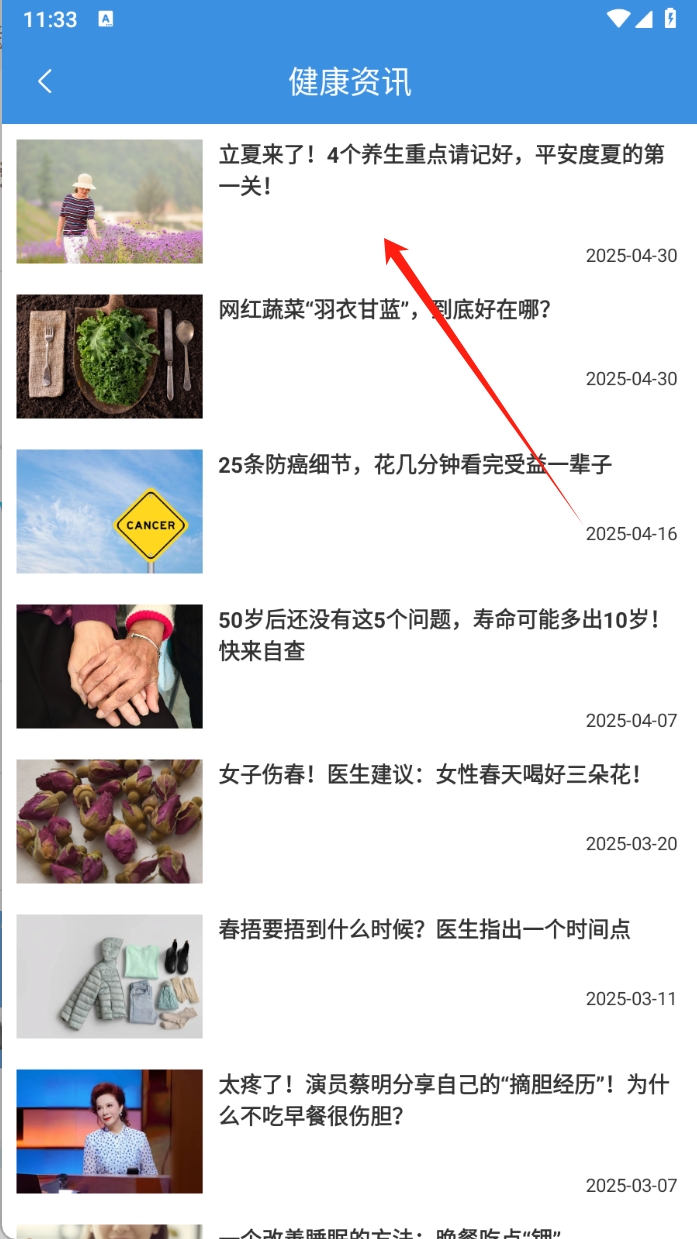 3、第三步:在健康资讯页面,浏览各类健康文章,点击感兴趣的标题查看详细内容。这将帮助你获取更多健康相关的信息。