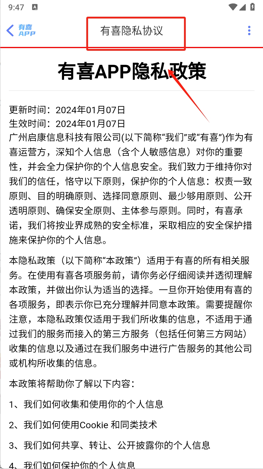 3、第三步:在隐私政策页面,阅读并同意《有喜隐私协议》。这是使用APP前必须完成的步骤,以确保你了解个人信息的处理方式。
