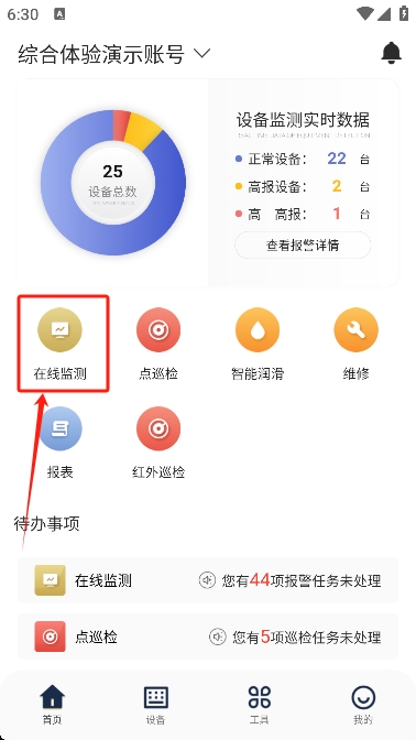 3、登录成功后,您将看到设备监控的主界面,点击“在线监测”图标。通过点击该图标,您可以实时查看设备的运行状态和相关数据。