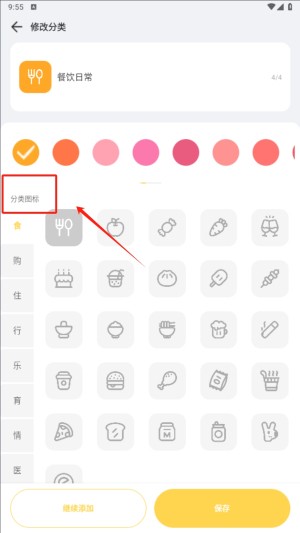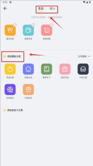 3、点击“添加模板分类”,选择或修改支出/收入分类。