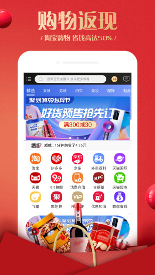 1、限时抢购,每天上百款天猫品牌商品专区;知名品牌,美食,美妆,家居,配饰,数码,服装等。