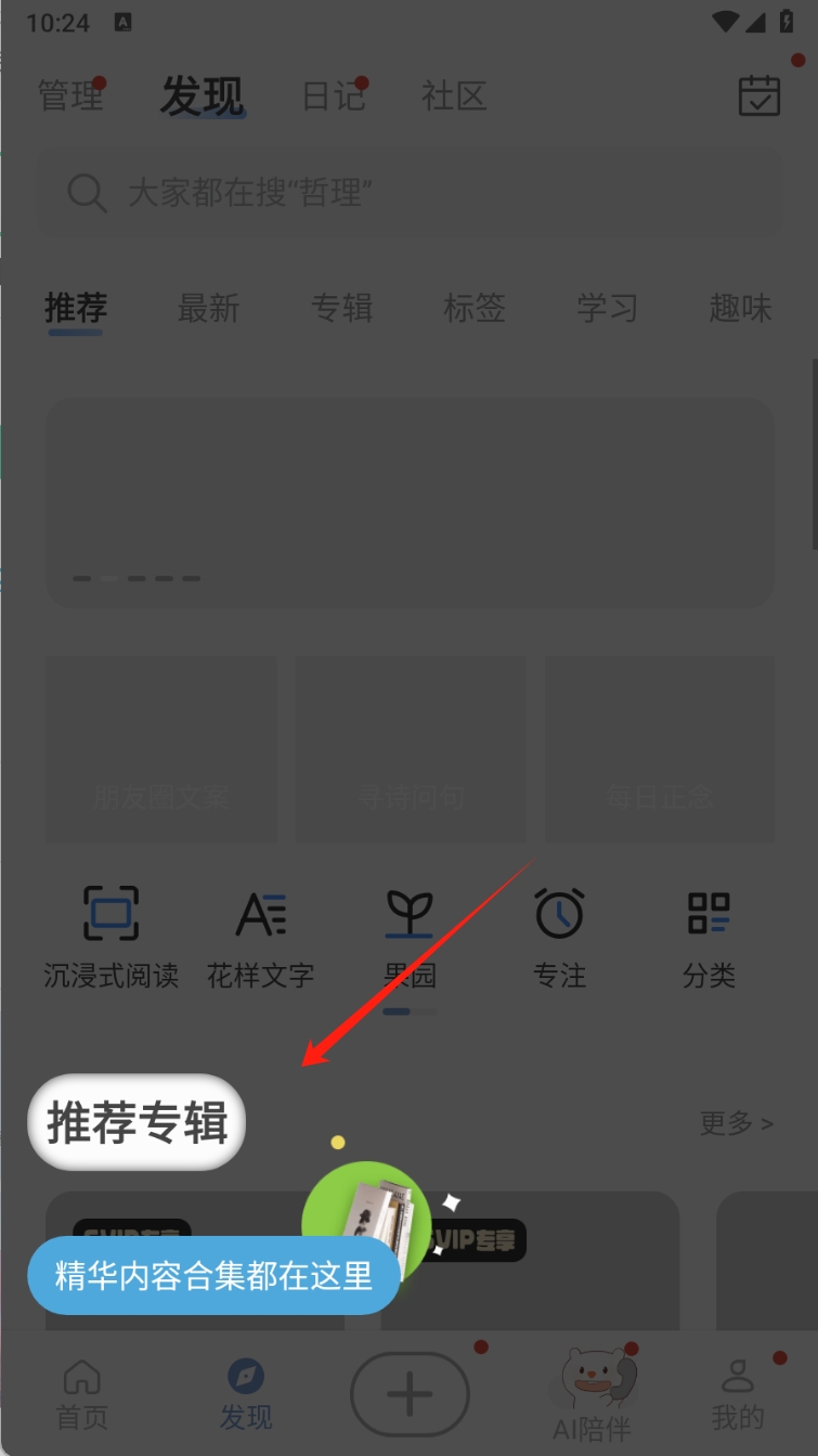 1、在软件的“发现”页面,点击“推荐专辑”按钮,查看推荐的精华内容合集。