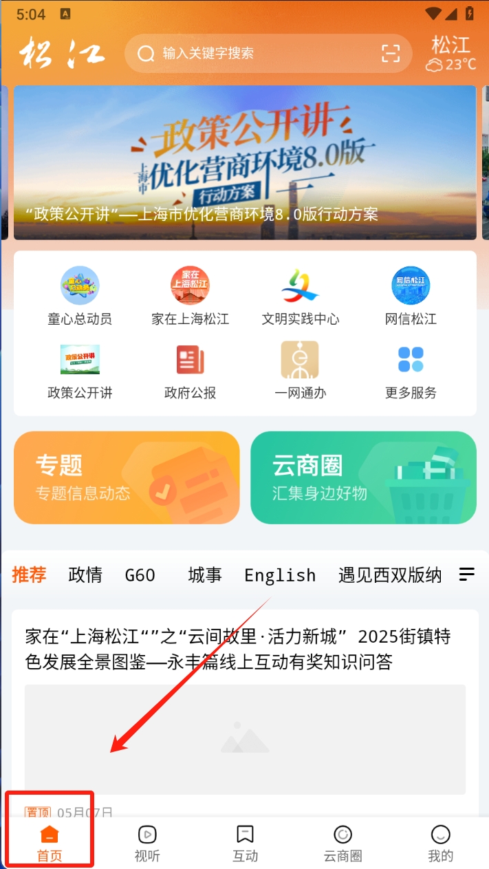 1、打开松江APP,点击首页导航栏中的“首页”选项,进入首页浏览推荐内容。