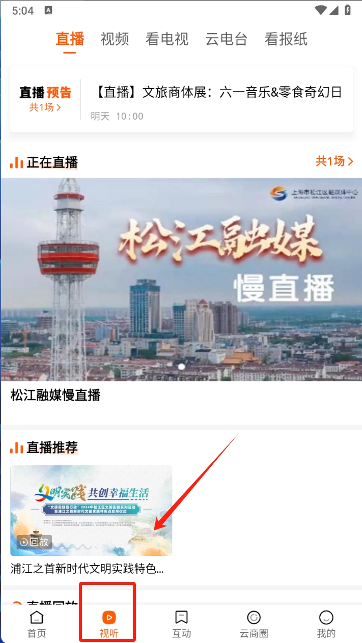 2、在首页中,点击“视听”选项,进入视听页面查看直播和视频内容。