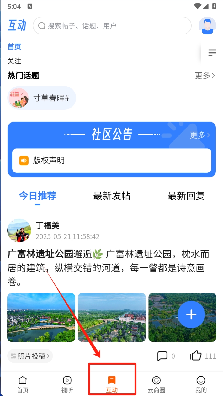 3、点击底部导航栏中的“互动”选项,进入互动页面参与社区讨论和发布帖子。