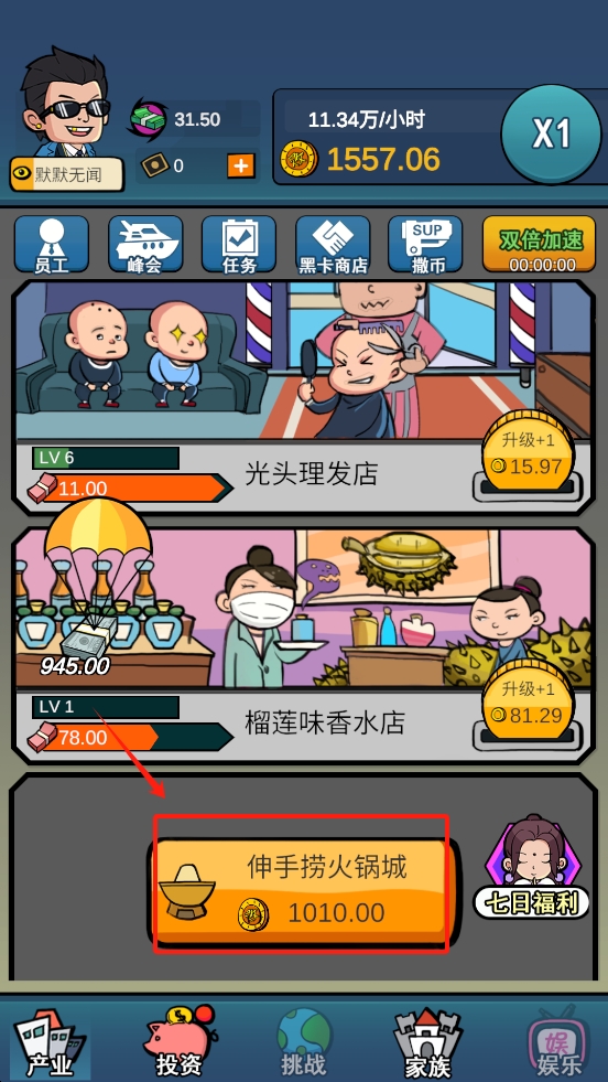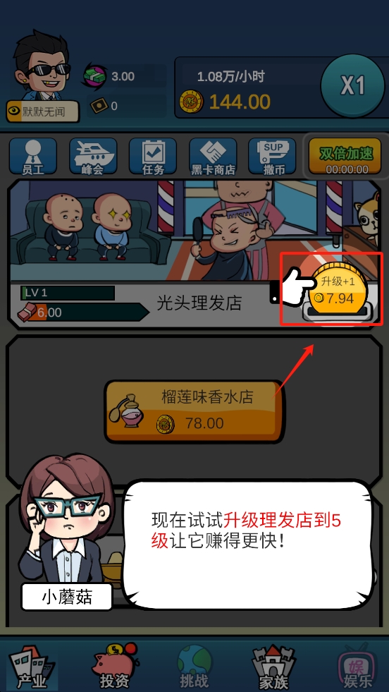 1、在产业界面,点击光头理发店右侧的“升级+1”,消耗金币升级店铺至更高盈利级别。