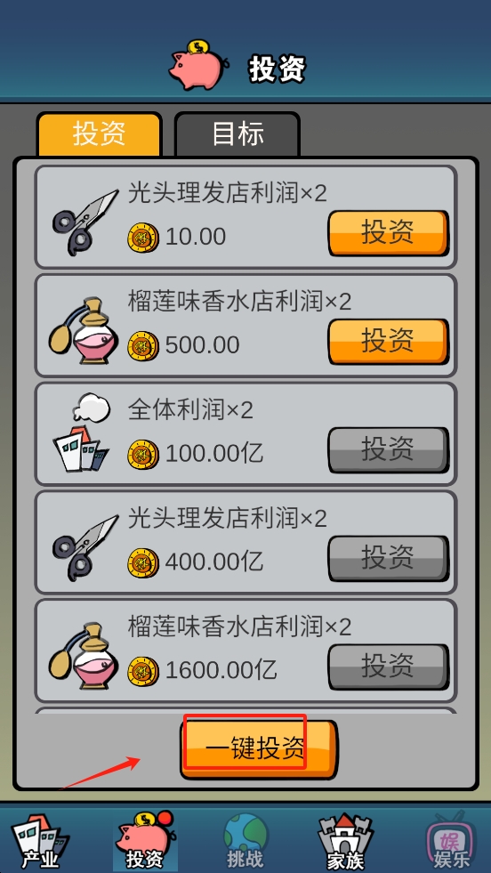 2、在投资界面,点击下方的“一键投资”,一键投入所有可投资的项目,实现利润倍增。